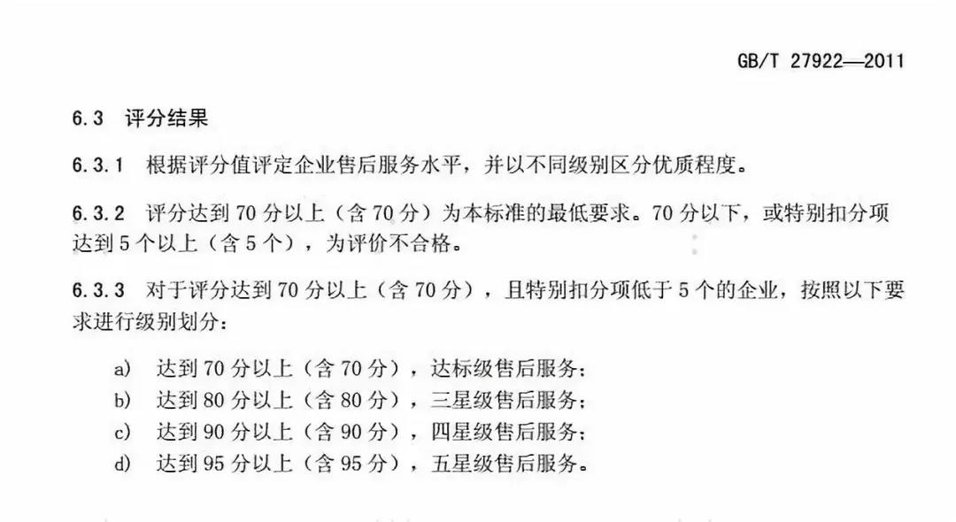 (中华人民共和国国家标准-商品售后服务评价体系第六项第二款评分要求)