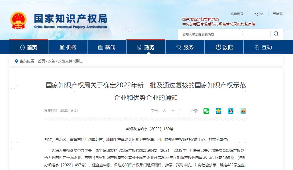 10月31日,国家知识产权局官网正式发布《关于确定2022年新一批及通过复核的国家知识产权示范企业和优势企业的通知》。