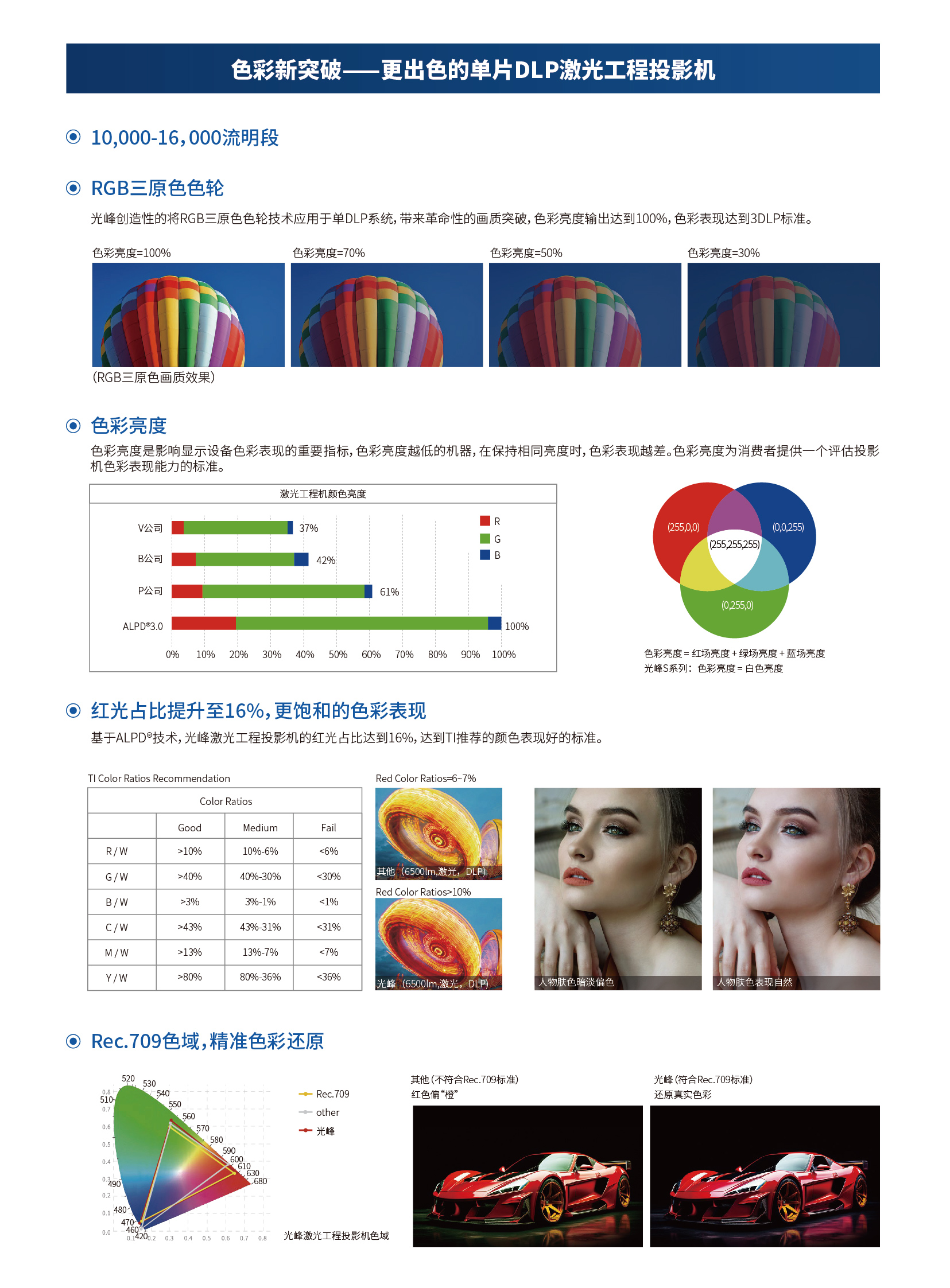 激活色彩S系列工程投影机,RGB三原色技术,色彩亮度100%。
